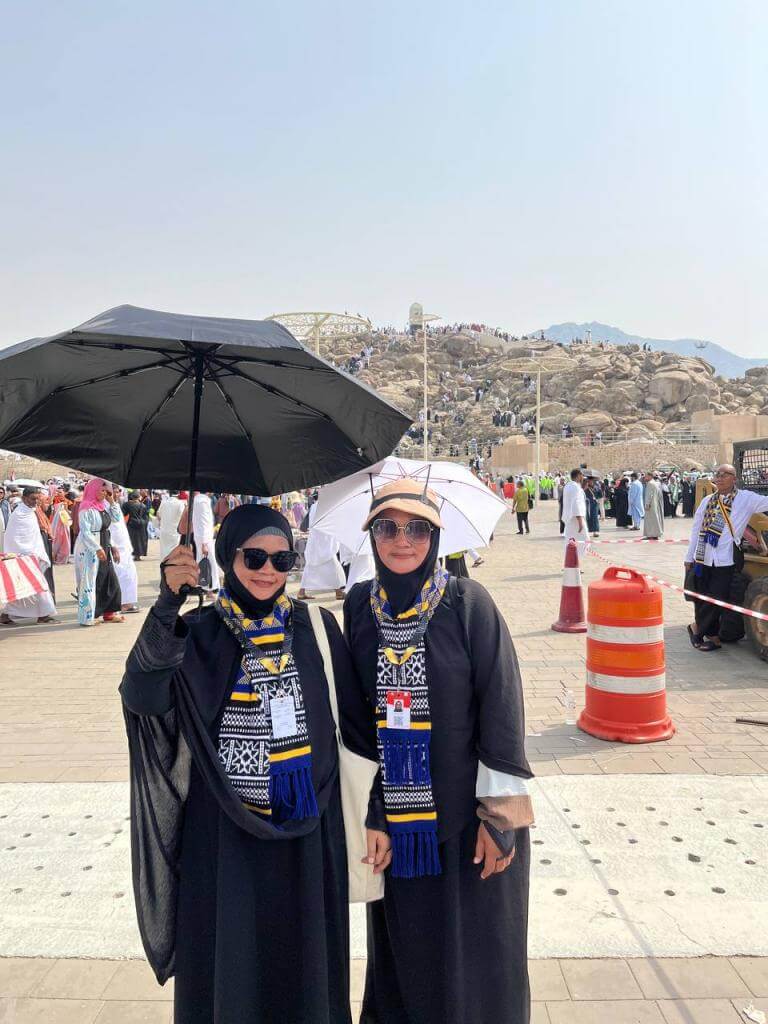 Banyak jemaah yang sekarang malah sengaja bawa payung warna-warni biar makin aesthetic saat ambil foto di depan tugu Jabal Rahmah. Frame-nya makin kece dan viral! -